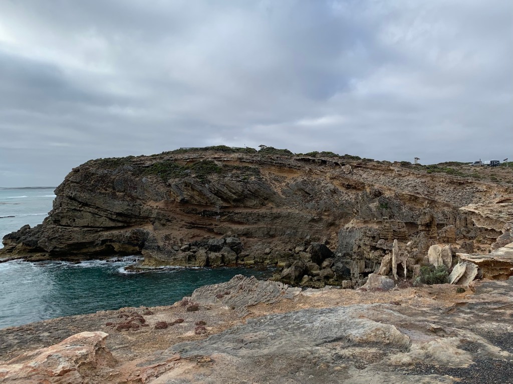 We have opted for another free camp for the night, setting up at the Lighthouse car park. We had the place to ourselves (not surprising as it was cloudy, windy and relatively cold compared with the last few days!). Not deterred by a windy night on a headland, we certainly enjoyed the view of the dramatic Limestone coast. It’s easy to understand why so many ships were wrecked in this area in the late 1800’s when you look at the very sharp rocks.