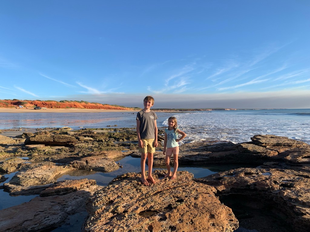 After two nights at Pardoo, we hit the road for one night stop at Eighty Mile beach where it felt like we had found an oases in the desert. After days and days or red dirt, we found ourselves surrounded by green grass and frangipani trees. Once again, a large property has been converted into a caravan park by the beach and the place was packed with travellers heading north and south along the highway. Eighty mile beach offered some spectacular shell collection options and the kids (feeling creative) built their own coral reef on the beach from random things they found washed up on the shore.