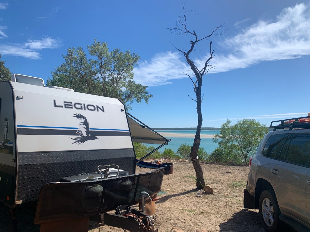 200km north of Broome, we set up our 69th camp at Gumbanan Bush Camp. Owned by the Davey Family, a small area of land has been cleared on the cliff top to create an area for camping. Noting how close we still are to Broome and the peak season we are travelling this area, the camp was busy when we arrived and really filled up as the afternoon progressed. Even with a camp full of other travellers, we felt a million miles away from the crowds on the caravan parks in town. It’s the kind of place where you drive in and find somewhere to camp. On our first morning, we noticed a couple packing up their van at one of the best spots on the site so I quickly sprung into action to assemble the family to be ready to move! Clearly the practice of packing up our van over the last six months is now second nature to everyone and within 10 minutes we were ready to move as soon as they left.