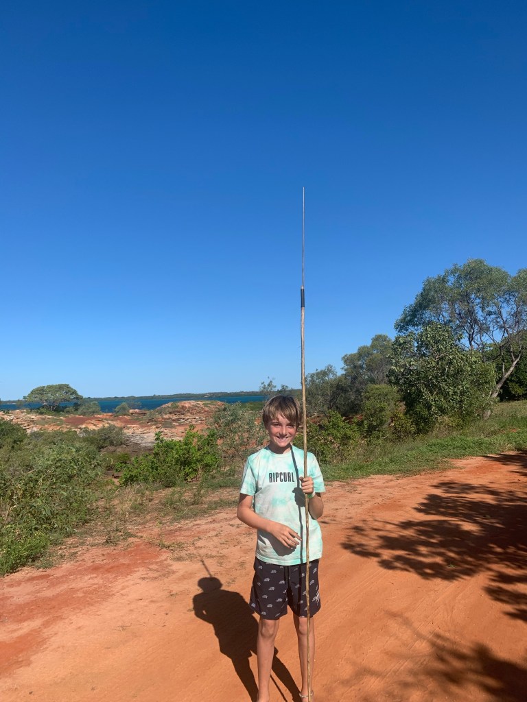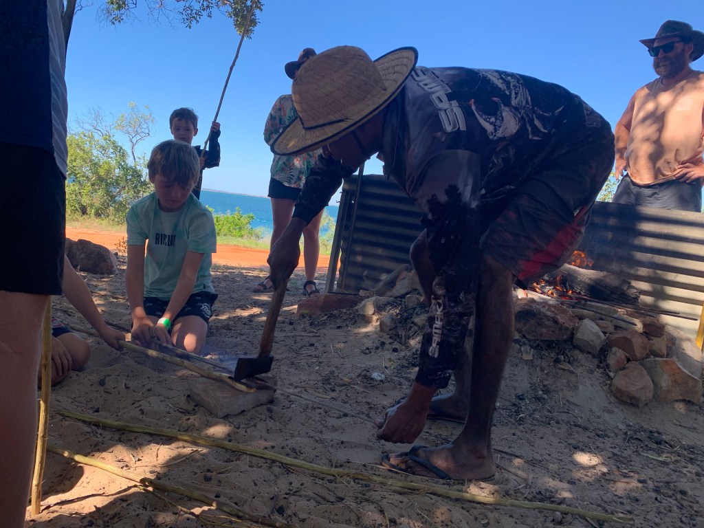 Arriving back at the camp ground, we noticed a small group of four boys assembled around a fire with two of the traditional owners from the family. The boys were being taught how to make spears. Thankfully we had arrived back just in time and the kids were welcomed into the group. Kiera, with less patience than Finlay, lasted about 15 minutes and made a mini-spear.
