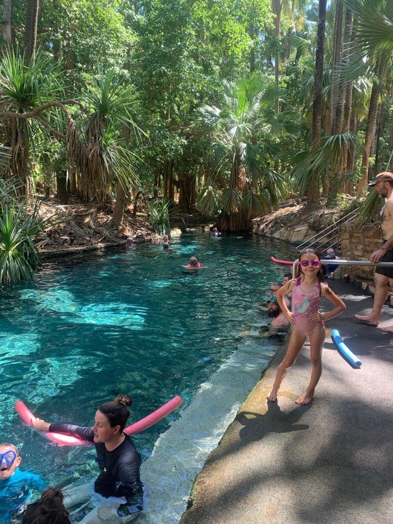 Day two we set out to explore Mataranka thermal pool. This creek has been lined with a concrete wall to create more of a man made pool effect but it is surrounded by palms and bush so you still feel like you are out in nature. The temperature in the thermal pool is 34 degrees… again not exactly a refreshing swim on a hot day but the colour of the water makes it so inviting.