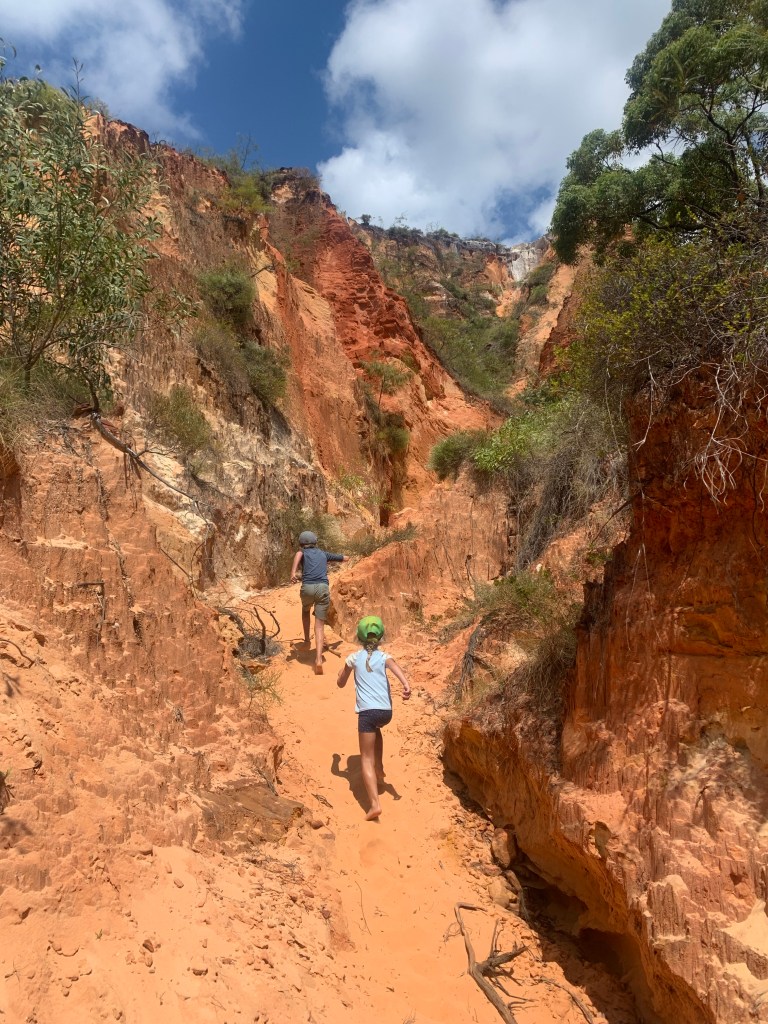 The area around Elim Beach is known for its coloured sands. The owner of the campground was pretty relaxed on his description of the ‘walk’ and noting we were walking on sand, we set off barefoot. Pretty soon into the walk we realised that was a mistake – the sand was so hot! We managed to hope between shady spots and quickly worked out which colour of sand was the coolest. Either way, the temperature of the sand kept us loving pretty fast up the dunes.