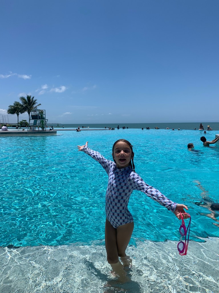 After a week or so out of the water and being locked in the caravan away from mozzies and sandflies, little miss Kiera is back to her usual cheerful self and her skin has healed really well. What better way to celebrate than a swim at the ‘lagoon at Yeppoon’?!! In reality, it’s not a ‘lagoon’ but it is a really awesome swimming pool. What’s more amazing is that it is run by the local Council and it’s free! I feel like this kind of place would be chaos if we had it in Sydney and we would probably never go but in Yeppoon it just works.